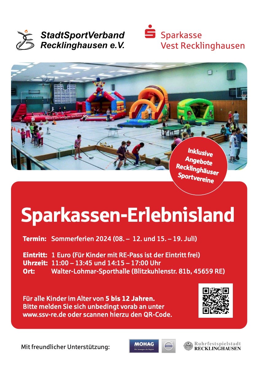 Vom 08. – 12. und vom 15. – 19. Juli 2024 findet das Sparkassen-Erlebnisland in der Walter-Lohmar-Sporthalle (Blitzkuhlenstr. 81b) in Recklinghausen statt. Jeweils von 11 bis 13:45 Uhr & 14:15 bis 17:00 Uhr haben Kinder die Möglichkeit, dem Spieltrieb freien Lauf zu lassen und mit Hilfe qualifizierter Sportfachkräfte bewegte und erlebnisreiche Stunden zu verbringen. Und das für nur 1 € (bedürftige Kinder mit dem RE-Pass kostenlos). Wie gewohnt gibt es neben den Abenteuer-, Spiel- und Sportangeboten mit Hallenhockey, Balanciergeräten, Tischtennis, Badminton, Kleinspielgeräten, Ballspielen und weiteren Mitmachangeboten auch interaktive Spielgeräte und verschiedene Hüpfburgen, die für Abwechslung und gute Laune sorgen.